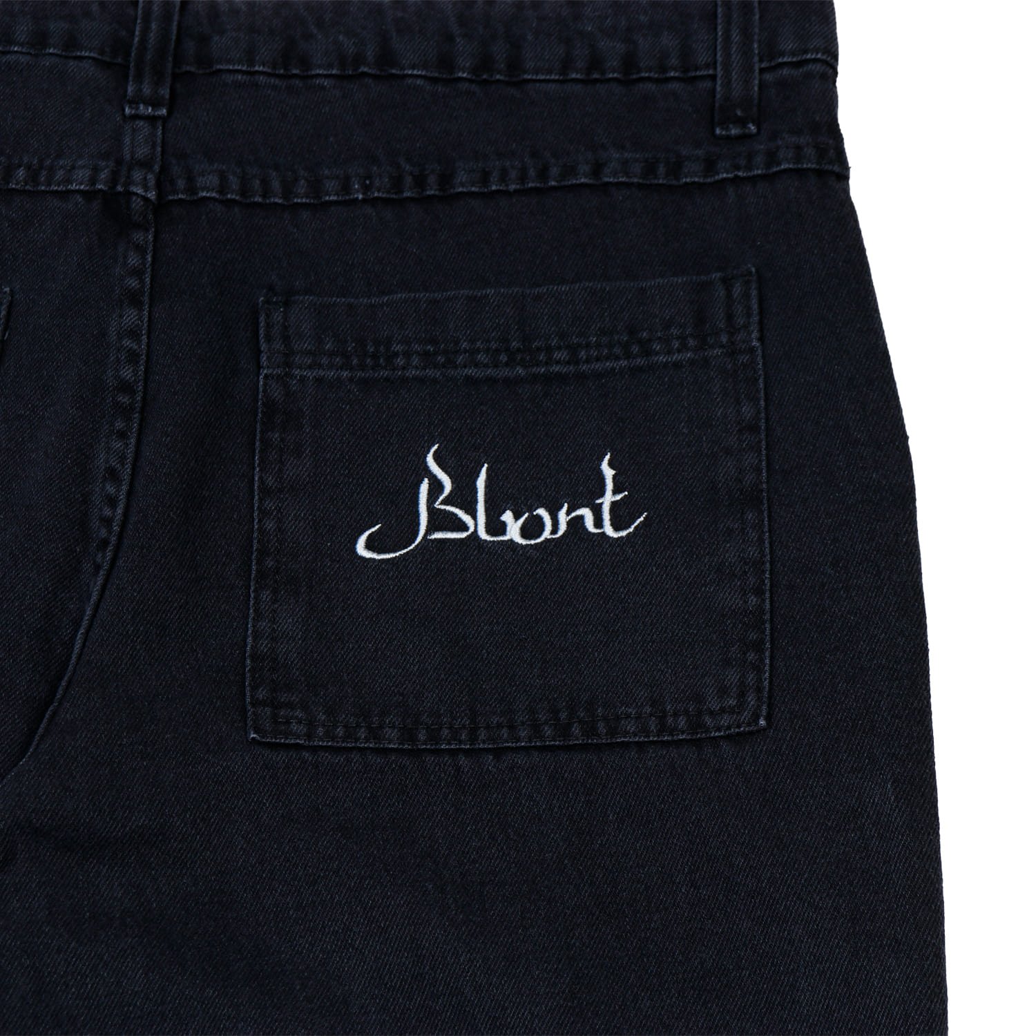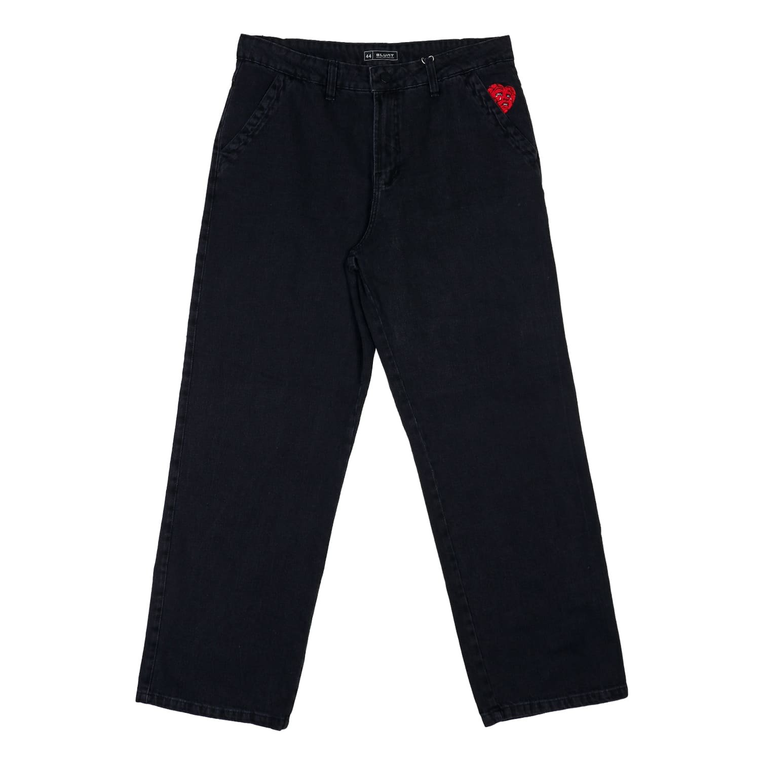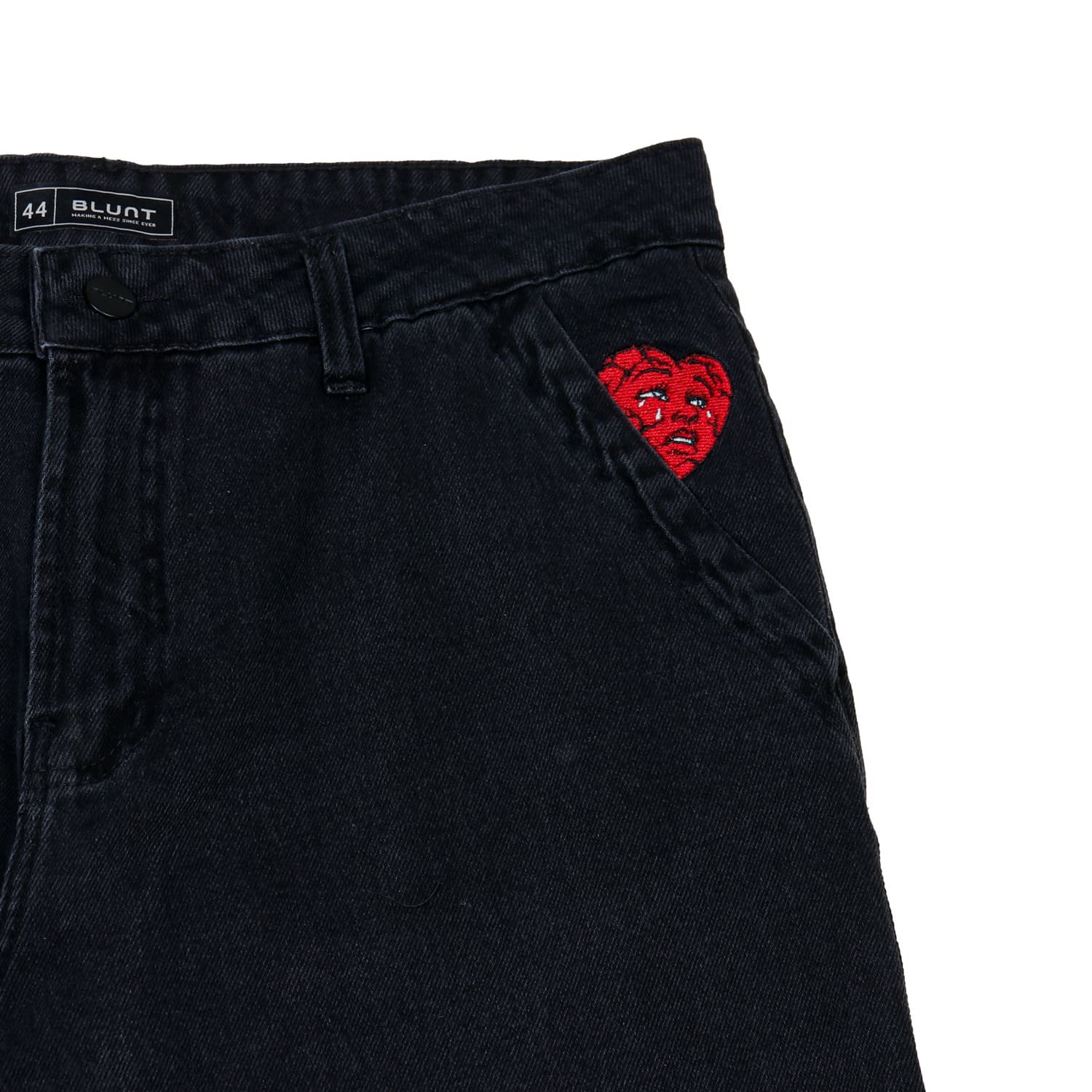 Cor Preto Material 100% algodão Bordado Coração no bolso dianteiro esquerdo Bordado "Blunt" no bolso traseiro direito Detalhes Confortável, resistente e estilosa