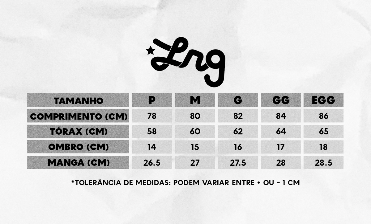 Modelo Básico Design simples, atemporal e versátil, ideal para diversas combinações e estilos. Manga Curta Garante conforto térmico e liberdade de movimentos, perfeita para o uso diário. Gola em Ribana Proporciona melhor ajuste ao pescoço e maior durabilidade da peça. Estampa em Silk Estampa exclusiva com alta qualidade de impressão, oferecendo um visual autêntico e marcante. Etiquetas LRG Personalizadas Detalhes que reforçam a originalidade da marca e o acabamento premium da peça. Confeccionada em Malha Vitalle Tecido 100% algodão, leve, macio e respirável, ideal para o conforto no dia a dia.