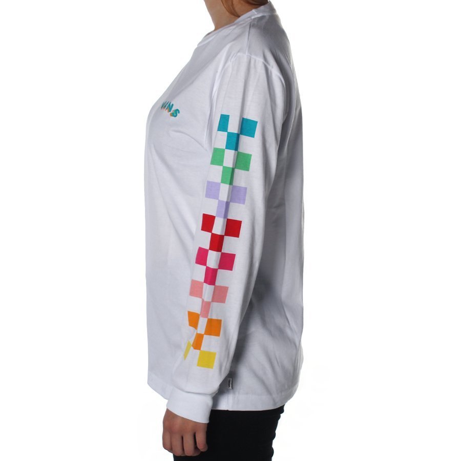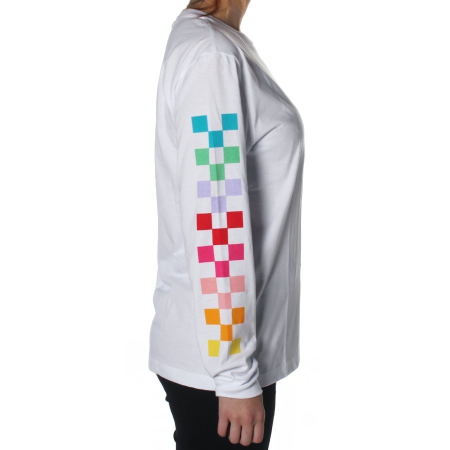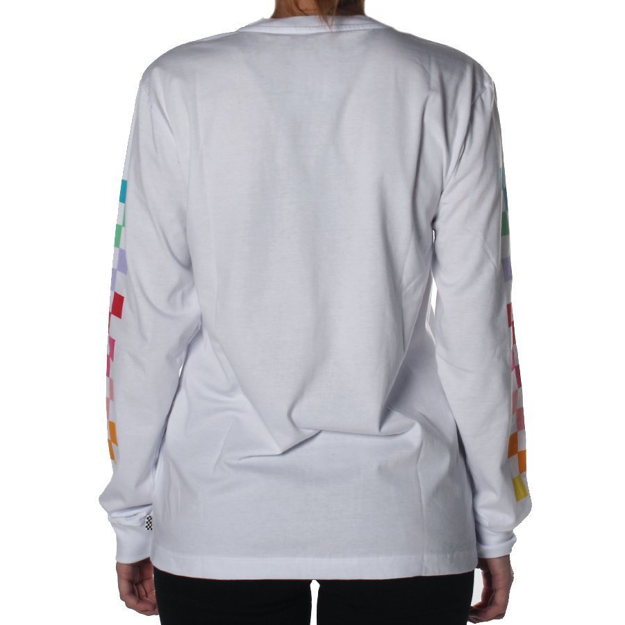 A camiseta manga longa Vans Radiate é feita de 100% algodão. Possui logo Vans personalizado aplicado na altura do peito e estampa personalizada nas mangas. carimbo com assinatura Vans na parte interna do colarinho e etiqueta com logo Vans aplicada na lateral.
