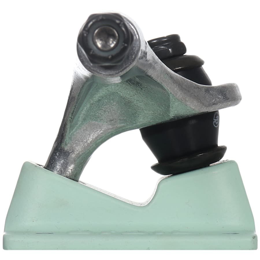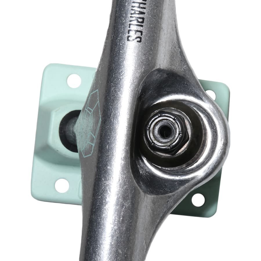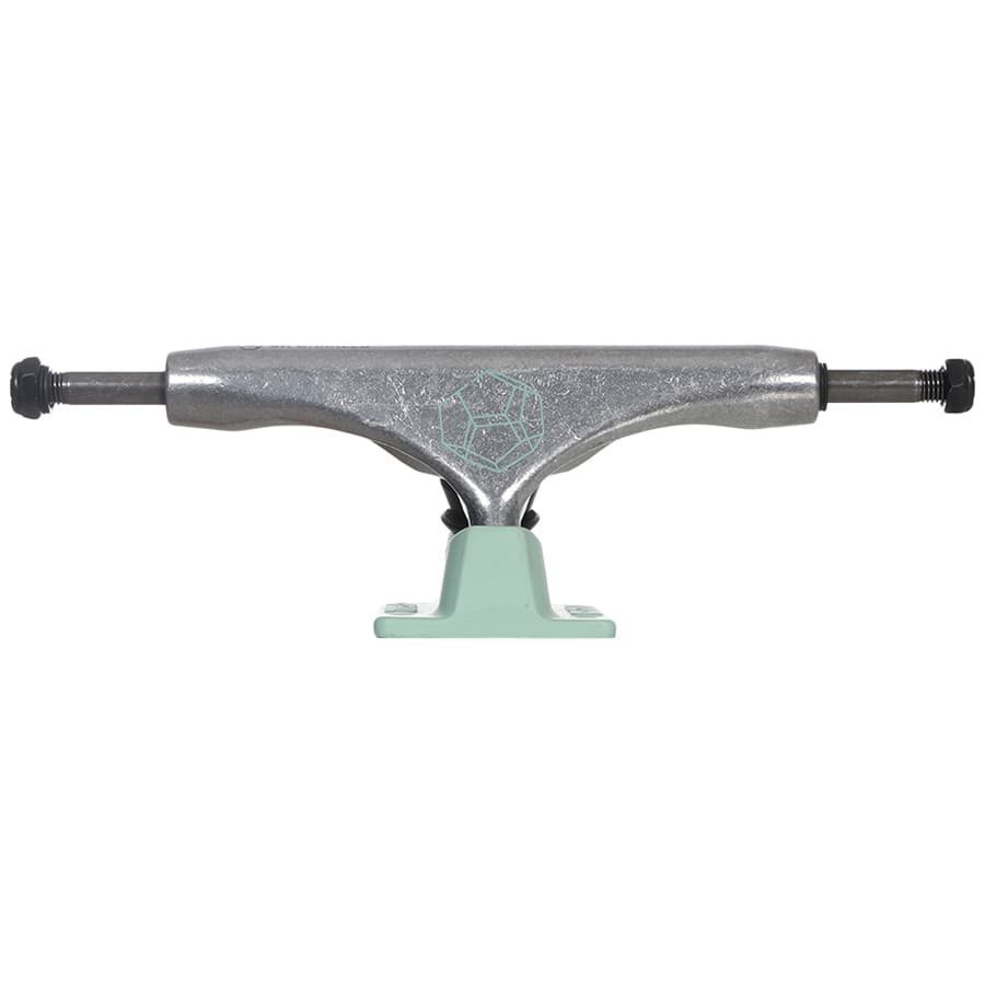 A cor prata com detalhes verdes dá um toque único e moderno ao truck, tornando-o não apenas um item funcional, mas também uma peça de destaque no visual do skatista.